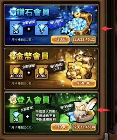 前者为钻石月卡后者为每日登录奖励。
