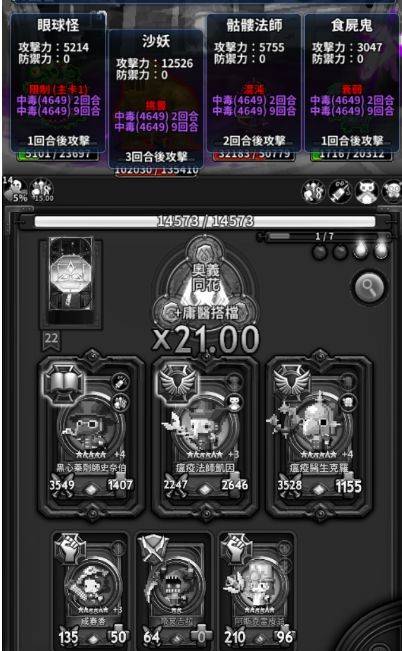 当然,实际上不会这么完美,卡手是一定存在的,副卡位只有3个,没办法同时攒火顺子和瘟疫组,比如手上有火顺子的两张,第三张沉底,那么摸到的瘟疫卡只能存一张,其他的就要丢了,一般优先存倍毒,没有加倍的毒伤经常要毒好几回合才能毒死怪,风险较大,其次是存毒吸,增加吸血,毒爆该丢就丢了吧,但是注意毒爆的技能是被动,所以如果直接打出去丢的时候,不能毒爆秒掉一个怪的话,要用妙计扔,毒爆会解除毒旗子的效果不能继续毒,没有杀死的怪就很难再杀死了,毒伤的计算后面会写。如果当前回合有一个血很多的大怪急需处理,则考虑丢火顺子来攒瘟疫组合来秒大怪。