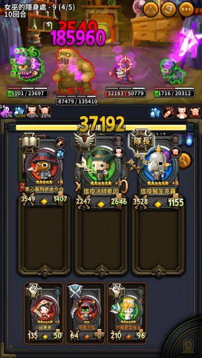 如果过牌足够,之前组合技的倍毒buff也会额外提升倍毒伤害,比如下面这个,之前已经放一次组合技+100%毒伤(buff在血条左上方显示),5回合内再次凑齐瘟疫3人组,倍毒量为1+100%+100%=3,计算毒伤=(4649+1593) X 3 X 1000%=187260