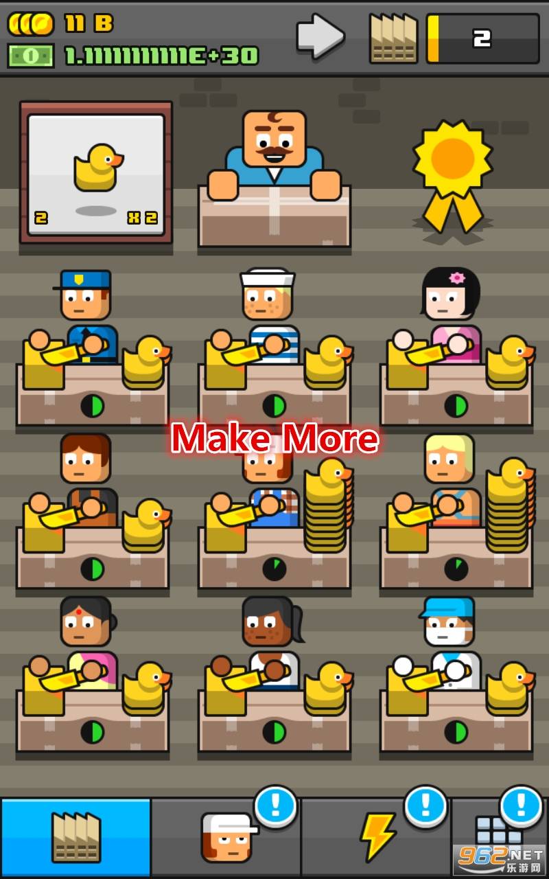 是一款 放置 玩法的模拟经营 小游戏 ,玩家在游戏中要扮演一位土豪老板,雇佣工人赶制商品赚取利润,然后扩大再生产,循序渐进。玩法上,《Make More!》较常 见 的 放置类游戏 并没有太大创新。玩家依旧可以用点击屏幕的方式增进游戏进程,而系统也依旧为你提供了一沓子等待升级或者解锁的新奇内容。不过无论如何,这些元素都归结于两个字——效率。 从亚洲人到非洲人再到欧洲人,甚至是外星人和 机器人 都会被你雇来搞生产。然而无论肤色和相貌怎么变,他们都只是你的 赚钱 工具 ,而你的方向也永远只有一个:赚更多!