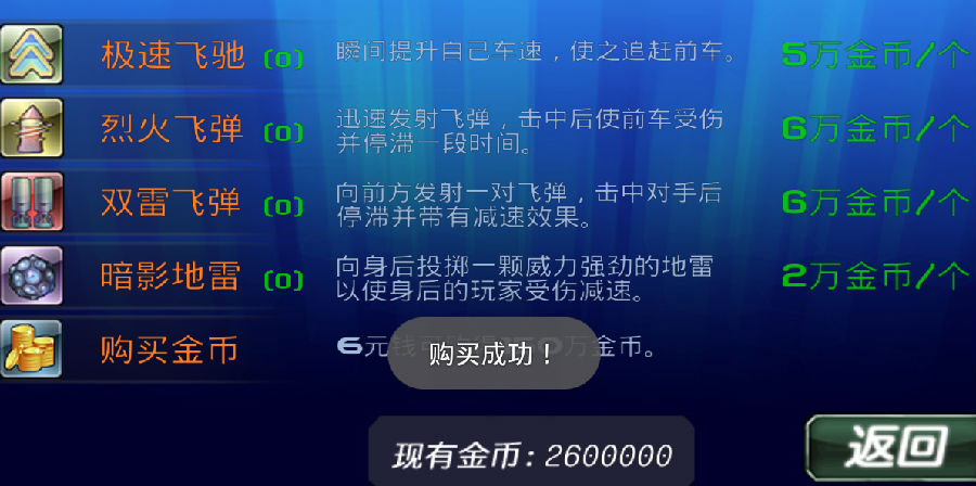 --在比赛过程中,玩家可以在屏幕左上角查看所在位置的圈数和总圈数,右上角为道具购买商城,当屏幕右侧中间位置出现道具标志之后,点击便可发射。左下角数字显示当前用时,右下角数字显示当前速度。