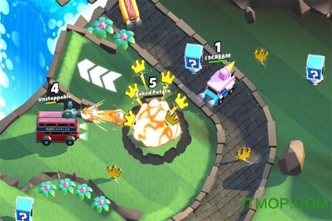 玩家每一次拾取道具都会对当前装备进行一次随机强化(威力提升,但是种类可能会发生变化),而一辆汽车被毁坏时,它之前所得的分数都将会以“王冠”的形式掉落,拾取这些王冠将会提高玩家的排名,随着排名不断上升,排在前列的玩家将逐渐成为其他玩家眼中的“香饽饽”。