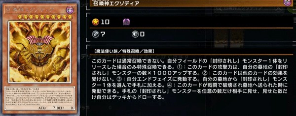 效果:这张卡不能通常召唤。「与艾克佐迪亚的契约」的效果才能特殊召唤。①:这张卡不会被战斗以及魔法·陷阱卡的效果破坏。②:自己准备阶段发动。这张卡的攻击力上升500。③:自己墓地是「被封印的艾克佐迪亚」「被封印者的右腕」「被封印者的左腕」「被封印者的右足」「被封印者的左足」的其中任意种不存在的场合这张卡破坏。