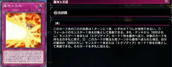 效果:「魔神火炎炮」的①②的效果1回合只能有1次使用其中任意1个。①:以场上1只怪兽为对象才能把这个效果发动。从手卡·卡组把1只「被封印」怪兽或者1张「艾克佐迪亚」卡送去墓地,作为对象的卡回到持有者手卡。②:这张卡从魔法与陷阱区域送去墓地的场合,以自己墓地1只「被封印」怪兽或者1张「艾克佐迪亚」卡为对象才能发动。那张卡加入手卡。