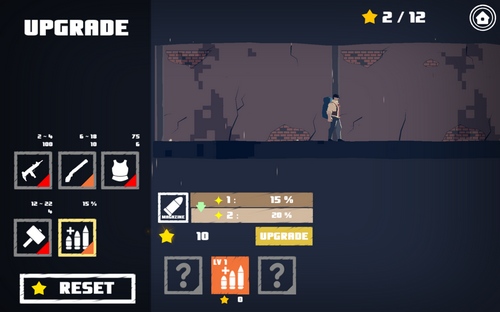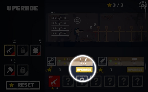 在通过第四关后,玩家就可以升级子弹扩容了,但是从一级开始就要10个星星,花费太多,可以先升级其他的武器。