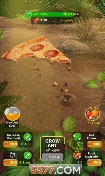 开始虽然只有一只孤独的蚂蚁,但当你在这款闲置游戏中一直吃下去,就会添加更多的蚂蚁到你的群落。而更多的蚂蚁意味着更多的收入与奖励。