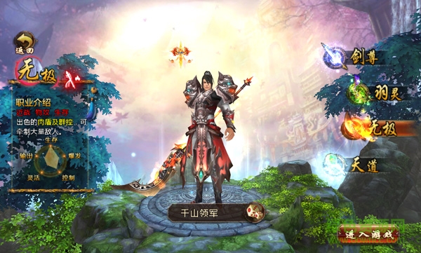 无极是《猎妖》唯一的纯物理近战控制职业,擅长使用长枪,具有超高血防不俗的伤害,同时还带有控制技能。在游戏中能够很好地吸引怪物仇恨,为队友提供良好的输出环境。缺点是没有远程技能,缺少远距离攻击敌人手段。在技能真空期难以靠近敌人。