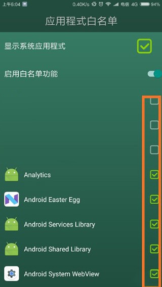 5、进入“应用程式白名单”界面以后,可以对所有应用设置,打钩的则是白名单,不会造成树的枯萎,相反,如果运行了没有勾选的应用,树就会枯萎;