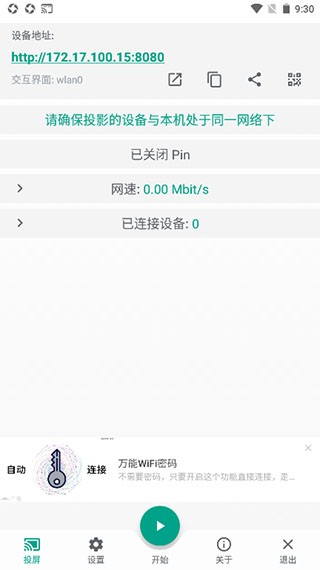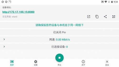 1、请用安装了“易互动”的手机打开软件界面,在首页点击“投屏”栏目,确认成功获取了“设备地址”,点击开始。