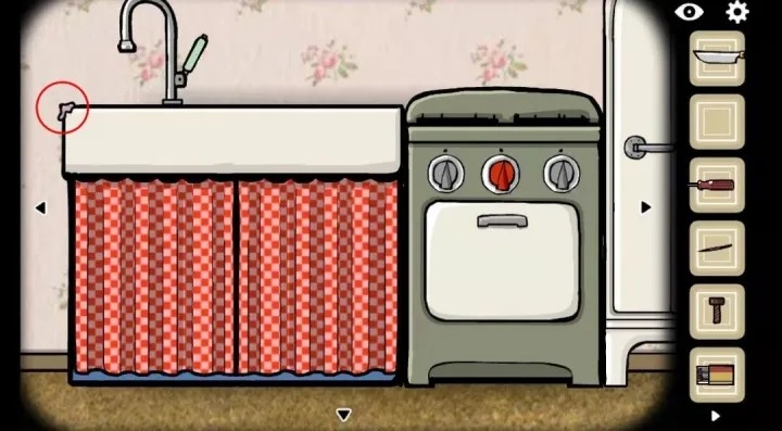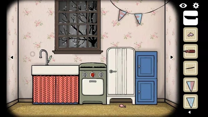 7、水烧开取下,窗户因水蒸气蒙上一层雾,结合第三个场景的墙上那张图片,在窗户上画一颗树,一个小小的高能后,取下窗户上的玻璃碎片。水池边的泡泡糖粘上了苍蝇,取下,用烧开的水去浇 第一个场景破败门外 显露的脚印,得到电池。