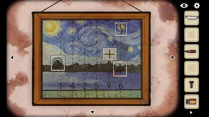 3、点击该场景梵高的画,将四张邮票如下图铺在上面。