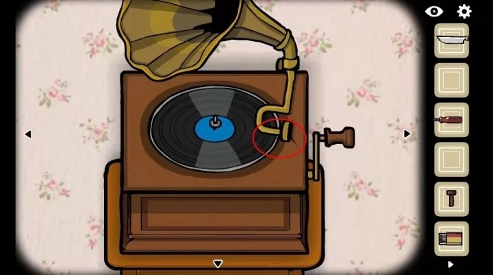 5、外祖父要来点music,回到第一个场景,点开唱片机将针放到下图红圈位置,再点一下红圈处,点下把手。