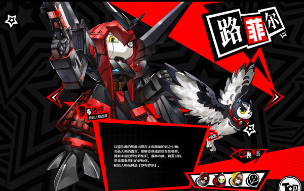 以猫头鹰的形象出现在主角面前的谜之生物。会说人类的语言,能够变身成送信车的模样。拥有丰富的异世界知识,遇事冷静,稳重自持,是非常靠得住的好伙伴。初始人格面具是『罗布罗伊』。