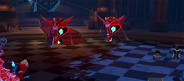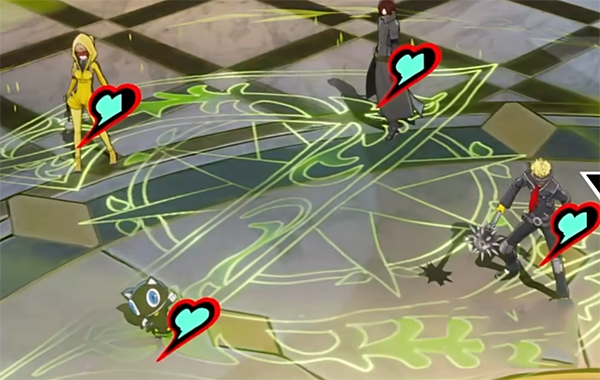 玩过P5的玩家对该游戏的玩法一定不陌生,游戏包含物理、射击、火焰、冰冻、雷电、疾风、念动、核热、祝福、咒怨、万能合计11种属性,而敌人也是对不同的属性有着不一样的克制效果, 战斗中采用对应的元素技能打击敌方的弱点就能将敌人击倒在地然后触发追击, 可以自选场上的己方角色来施展本次追击,如果再次击倒敌人的话还可以继续追击。