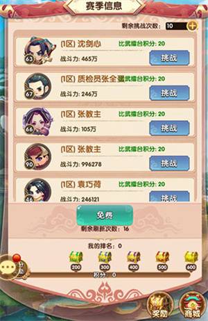比武擂台是游戏中最重要的本服pvp玩法,是玩家之间比武论道的聚集地,在这可以和其他玩家竞技!勇敢向排名上的玩家发起对战吧,除了常规资源奖励还可以得到荣誉,荣誉可以在荣誉商店中购买侠客碎片,得到不同的等级名次还能通过荣誉购买排名道具。