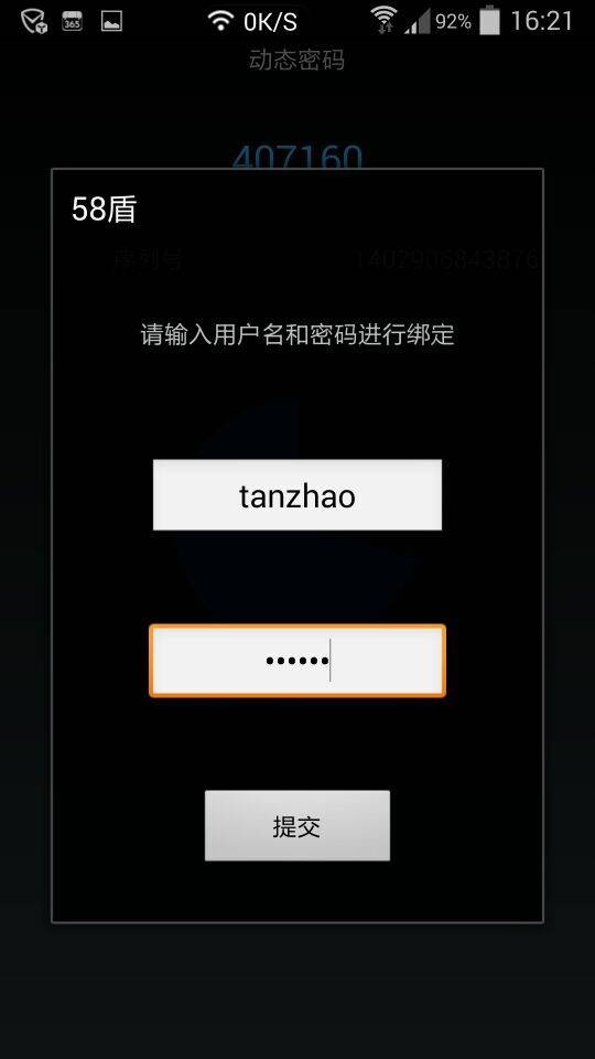 第一步:公司之外输入内部系统网址,弹出用户名密码输入框;此处输入本人OA用户名及58盾产生的动态密码,确认。
