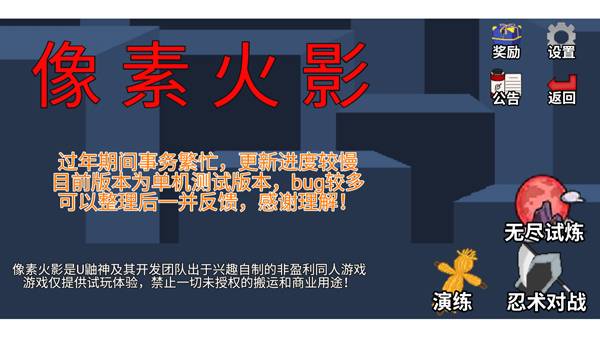 1、下载安装好像素火影红面具单机版,运行游戏,在这里我们可以直接选择开始、对战或者退出游戏;