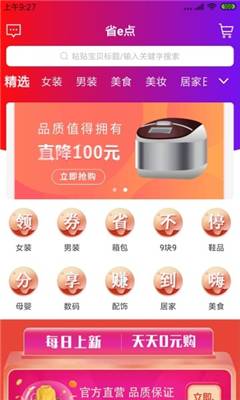 省e点app是一款主打购物赚钱的软件!在这里用户可以随时先领券再购物,购物省钱更省心,并且用户还可以将商品分享给朋友来赚取佣金,购买商品也是可以获得返利的,买的越多赚的就越多,喜欢的小伙伴快来下载体验吧!