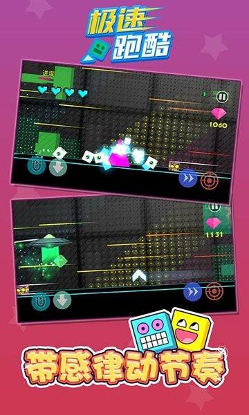 极速跑酷操作简单,玩家可以自由控制方块进行闯关冒险,搭配动感的背景音乐,你将在炫丽的卡通世界中不断跑酷,感受欢乐十足的游玩体验,并且还有诸多魔性的方块皮肤可供解锁哦。极速跑酷游戏介绍:极速跑酷是一款挑战智力与反应力的电音跑酷游戏。只需要踏着音乐的