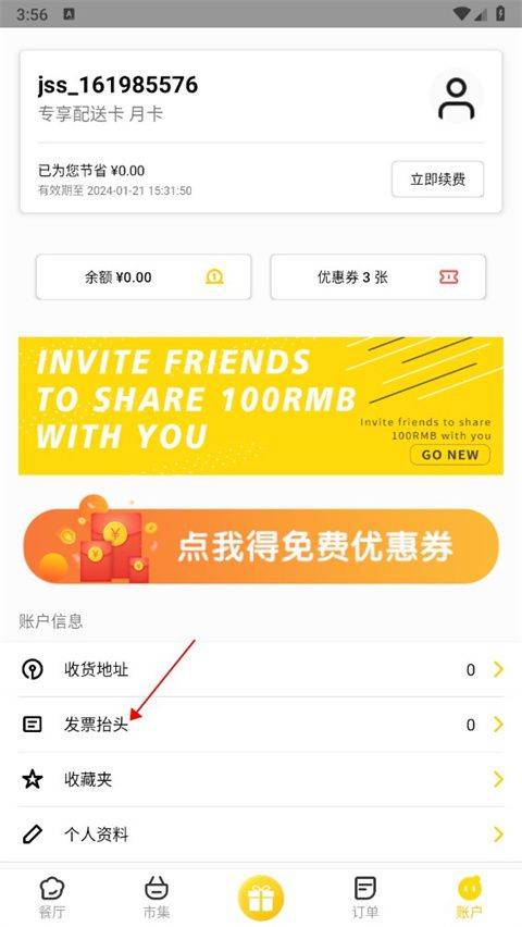 1、下载进入锦食送app,当我们需要发票时进入下方“账户”页面;