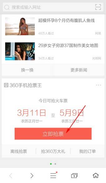1.进入360手机浏览器,下滑找到【360手机抢票王】