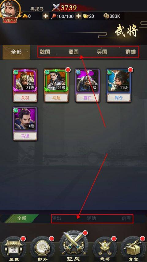 1、游戏内的武将都来源于三国世界,有魏、蜀、吴、群雄四个阵营,按照武将属性还分为输出、辅助、肉盾三大类型,每种武将都有自己独特的技能。