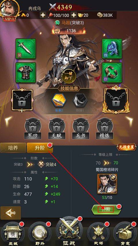 3、除了培养升级外,玩家还可以对武将进行升阶,消耗多余的武将碎片即可对武将进行升阶,大幅提高武将阶级以及战斗力。