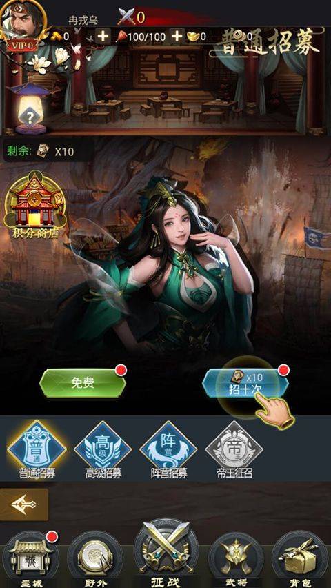 4、玩家可以通过武将招募来获取武将,武将招募分为普通、高级、友情三种招募类型,每种招募所获取的武将类型都不一样。