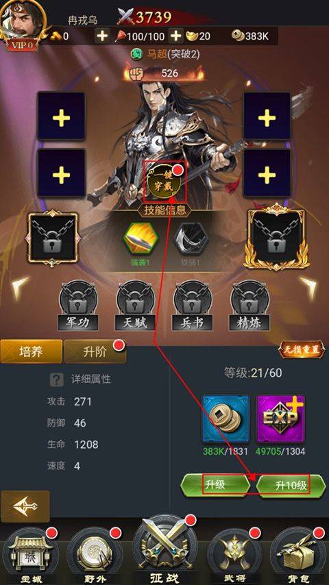 2、玩家可以选择武将进行培养升级,还可以给武将一键穿戴装备,提升武将属性战力。