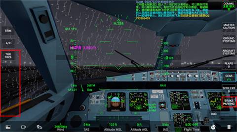 4、调整好襟翼后,我们就可以松开刹车BRAKE,然后滑动左侧的油门THR,将油门推到100%。