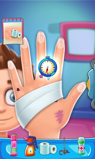 一款模拟医生手部护理的 小游戏 ,帮助受伤的小朋友们尽快恢复。冰敷,擦洗,消毒,上药,缝合,贴上创口贴...熟练掌握这些最基本的操作是成为一名优秀护理医生的基础。让我们开始吧。
