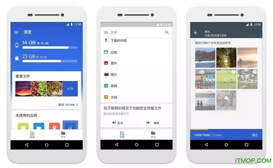 files go中文版 即Google文件极客,是谷歌专门打造的手机文件管理app,当你的手机越来越满越来越卡的时候,你就需要它啦!快速帮你清理垃圾,还能快速分享文件哟!需要的就来IT猫扑下载!