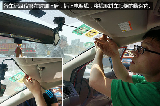 3、在确定行车记录仪的安装位置及走线方案后,第一步就是将记录仪的电源线塞进车顶棚的缝隙内。