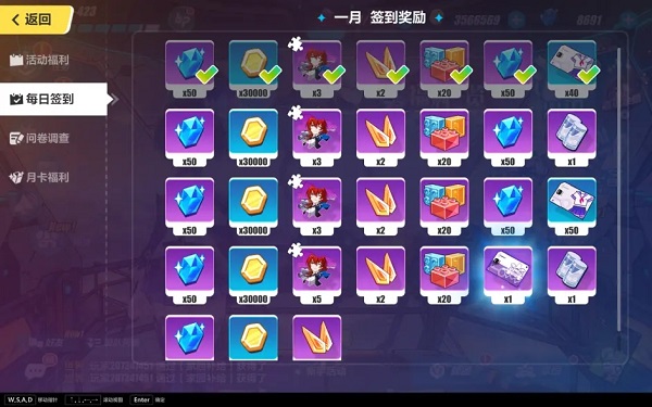 4、福利: 不太常用的选项,包括签到,月卡,祈愿等。但是因为每天第一次登陆游戏的时候会自动弹出签到和月卡福利,所以很多萌新甚至不知道它的存在。