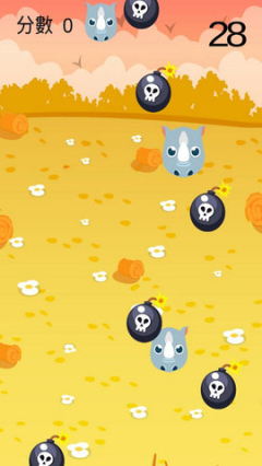 1.简单有趣的游戏玩法模式,你只需要点击犀牛,引导它们撞击炸弹,不要让炸弹落到手机底部,否则就会扣分