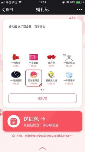 在电子请帖发给别人之后会,页面的最下方是有送礼页面的,礼物价值不等,新娘新郎会受到同等额度的礼物,婚礼纪app会在您的余额中显示,余额可以体现或者是平台消费。但是体现会有0.6%的微信支付服务费用。