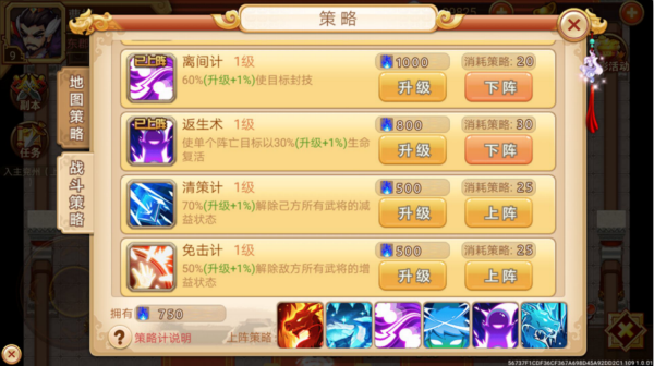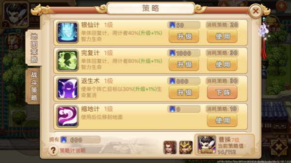 地图策略主要为增益辅助类。主要策略为银仙计,完复计,返生术,缩地计,飞渡计。