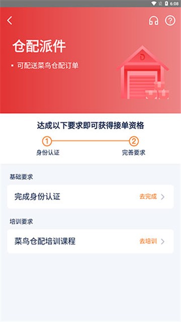 4、接着按照指引,完成身份认证和菜鸟仓配培训课程就可以正式成为骑手了。