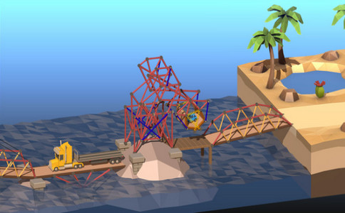 4、第四关可以继续沿用第三关的搭建方法,不过要注意的是该关卡中由于桥面横跨的幅度更大,所以最后建成后不能经受住卡车通过试验,轿车通过是完全没有问题的。