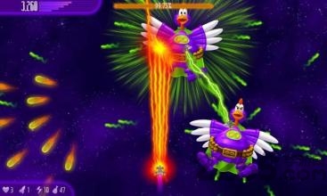 在猎杀怪鸡的时候,有时会有掉下礼物,接到后,武力将可以增强,更有效率地对抗敌人,共有3种不同类型的子弹可以替换,各有优势。和同类游戏相比:敌人出现的位置变化丰富;每通过一个星球后,还会播放幽默的场景动画;不过要注意躲避众多陨石的攻击。