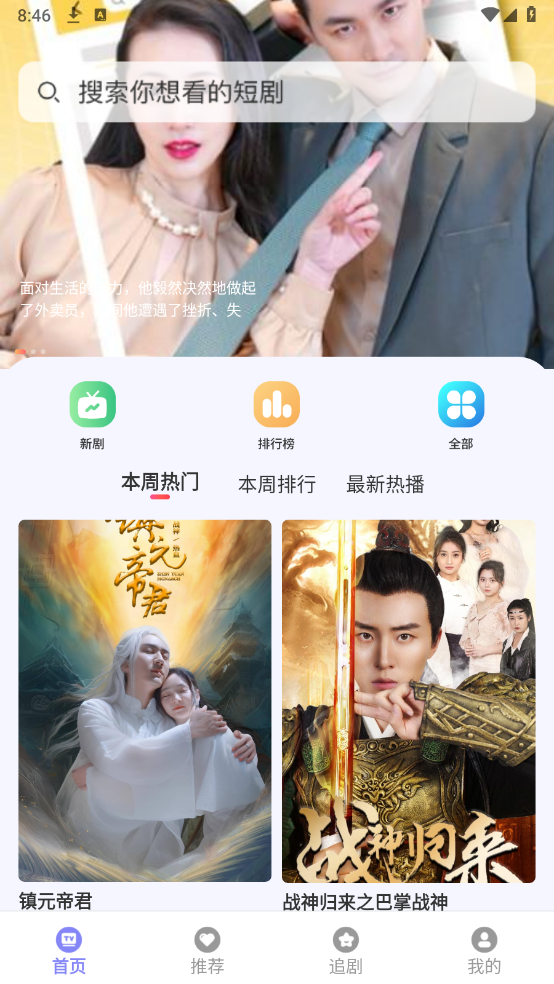 2、进入首页,可以看到很多的短剧资源,包含了言情、都市以及悬疑等。