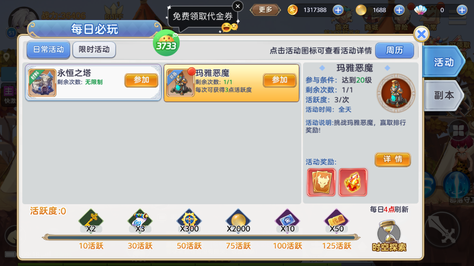 (1)玛雅秒杀券:用于在玛雅神殿秒杀BOSS直接获取奖励,并有10%的概率获得双倍奖励。