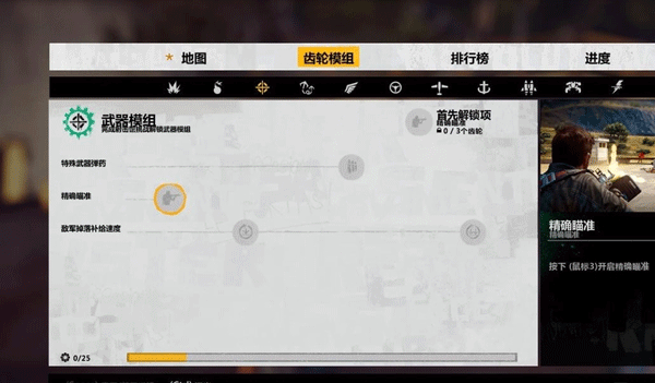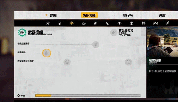 4、当我们升级后,会发现原本的,精准瞄准,已经亮起了绿色,这就说明我们已经升级成功了,并且我们解锁了相应的动作。