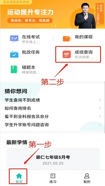 首页会显示最新学情,如果要查看最新考试分数,可以在最新学情里选择班级本次考试的学情报告,然后点击相应的课程即可查看相应课程的考试得分情况。如果要查询以前某次考试的得分情况,可以在首页选择历次学情。