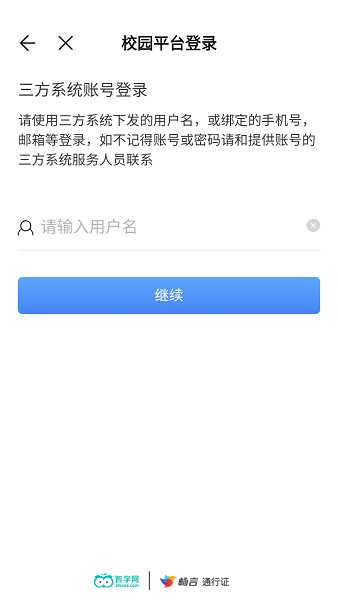 如果是“校内平台登录”,就点击底部的按钮,输入用户名,点击“继续”,接着按要求完成登录即可;