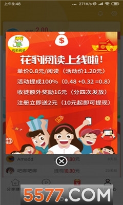 花豹阅读app是一款涨分快,单价高,比较优质的阅读类赚钱项目,隶属于欢喜联盟旗下,这里不止有转发奖励,还有签到奖励和邀请红包,提现门槛低,有效点击高达1.28元,感兴趣的不要错过了!