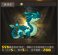 青龙 :青龙的效果是净化.前期玩家只能通过开箱子或抽奖获得.再加上其效果很微妙,只有针对敌方状态队伍才会有显着效果.目前不推荐装备它.