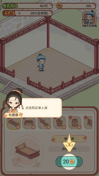 5、点击一下租客住的房间,就可以开始为租客购置生活必需品了,比如床之类的。