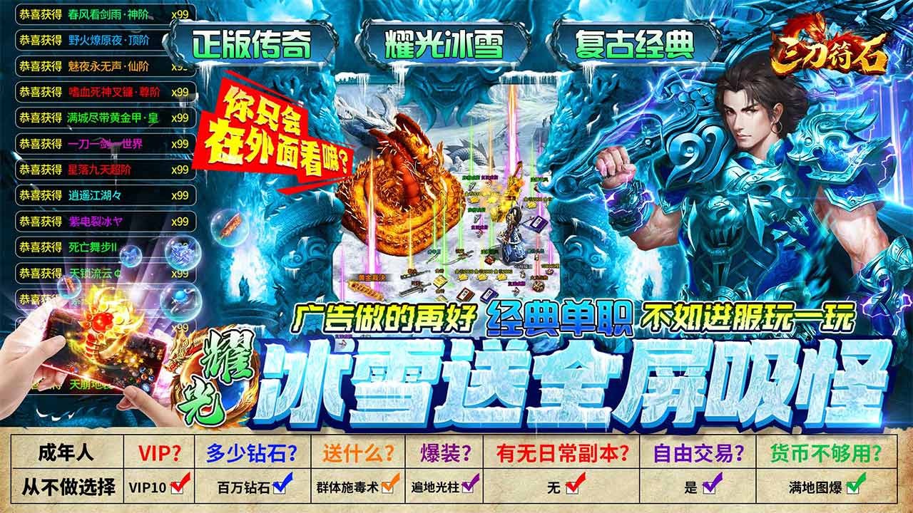 三刀符石高爆打金版传奇来袭,经典的打金系列传奇竞技游戏,单职业传奇竞技游戏,全新的传奇竞技模式轻松尝试体验,复古冰雪系列传奇,刀刀轻松暴击出资源,大量的传奇副本玩家们轻松尝试体验,超乎玩家想象的传奇竞技游戏,轻松打怪升级,传奇装备轻松全爆,非常值得去尝试的传奇竞技游戏。