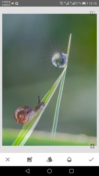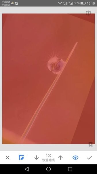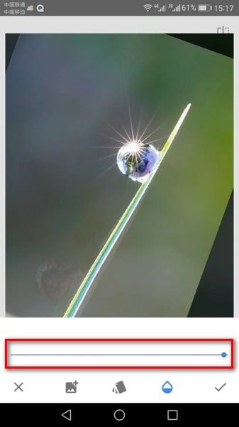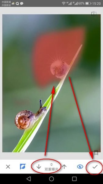 接着点击底部的“↓”把把双重曝光的数值改为0,并用手指在红色的蒙版上面擦;这里需要耐心,可以用两个手指尽量的将画面放大,擦到最后只留下水珠,越精细越好;擦满意了就点击右下角的“√”;